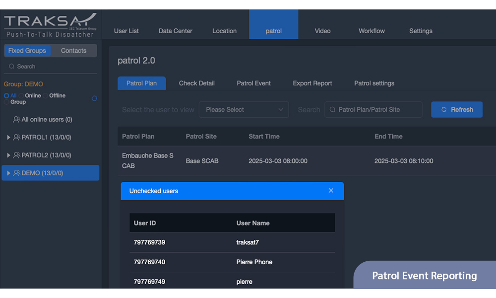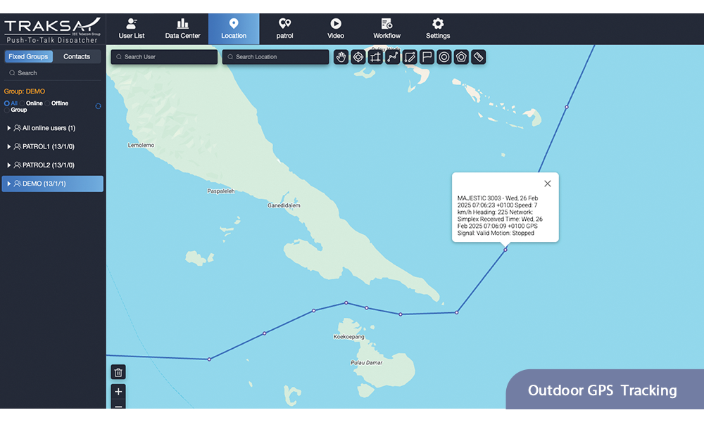 Designed for maritime operations, Traksat PTT (push-to-talk) delivers real-time communications at sea. From instant voice, video, and data sharing over hybrid networks to GPS tracking, patrol tools, and workflow automation, Traksat PTT is a powerful solution for dynamic coordination. Moreover, it is fully encrypted and customisable – group and one-to-one calls over IP, cellular, or the Starlink satellite network as well as a central command interface elevate real-time visual dispatching and media management. Traksat PTT empowers search & rescue (SAR) teams to assess needs and escalate emergencies in seconds; ensures timely patrol check-ins and guides the crew with mapping guides for onboard maintenance tasks; and enables coast guard and naval inspections with automated workflow tracking.